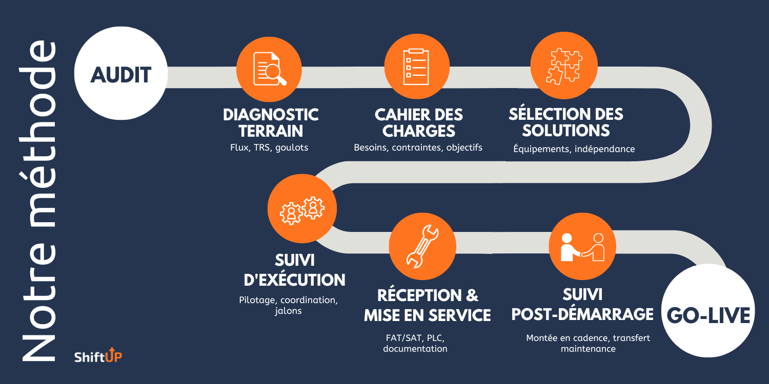 Nous avons développé notre propre standard méthodologique, construit sur dix ans dans l'industrie automobile française et adapté au contexte industriel marocain — composants disponibles localement, équipes de maintenance autonomes, contraintes de continuité de production respectées.
